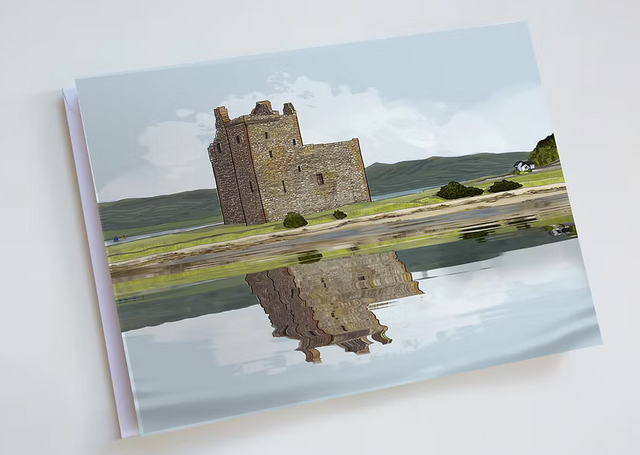 Featuring a beautifully detailed illustration of Lochranza Castle on the Isle of Arran, this greetings card offers a charming way to share a message inspired by Scotland’s landscape. Set beside the calm waters of Loch Ranza, the artwork highlights the castle’s distinctive structure and the dramatic natural setting that surrounds it.